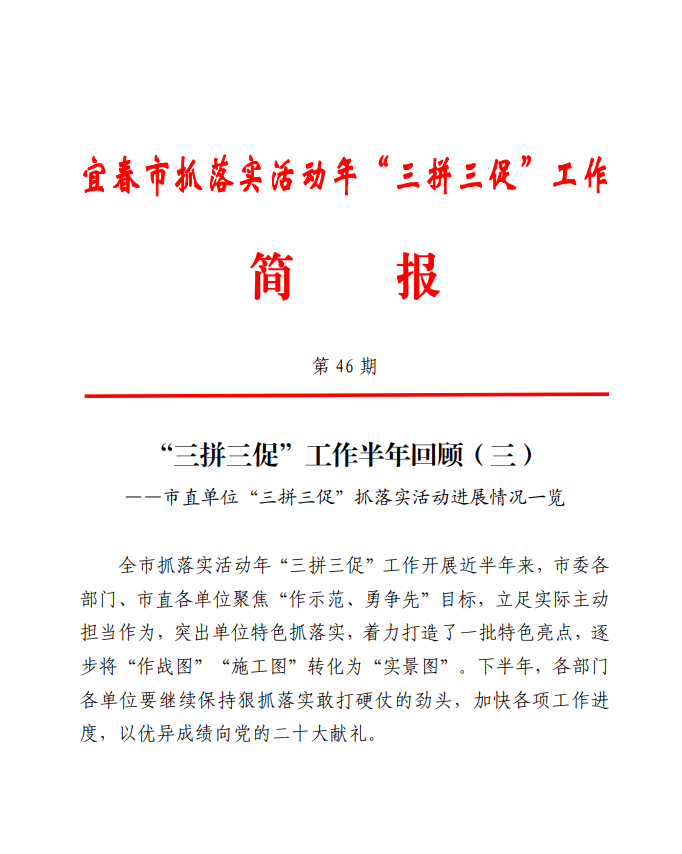 7月9日,《宜春市抓落實(shí)活動(dòng)年“三拼三促”工作簡(jiǎn)報(bào)》(第46期)對(duì)“三拼三促”工作進(jìn)行半年回顧,對(duì)市直單位“三拼三促”抓落實(shí)活動(dòng)特色亮點(diǎn)情況進(jìn)行通報(bào)。我公司作為全市唯一一家市屬國(guó)有企業(yè)順利入選半年優(yōu)秀案例榜單。
