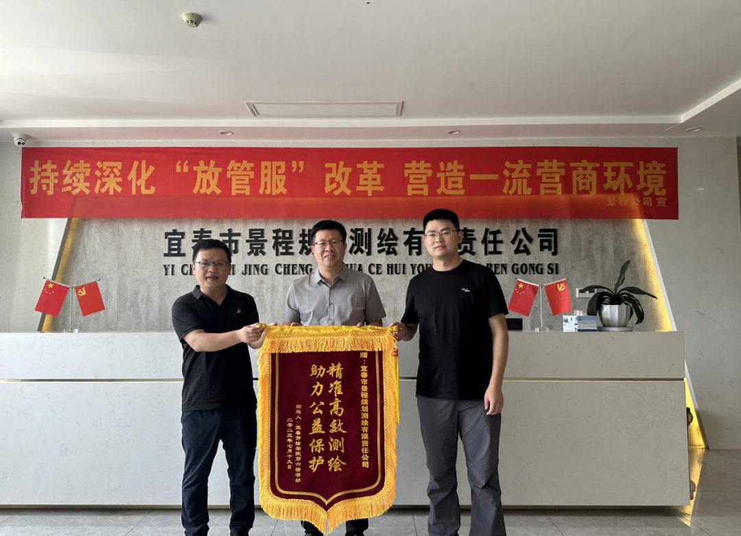 “高標(biāo)準(zhǔn)農(nóng)田領(lǐng)域行政公益訴訟專項(xiàng)監(jiān)督順利推進(jìn)取得實(shí)效,離不開景程公司的技術(shù)支撐與助力,為你們的測(cè)繪服務(wù)與企業(yè)擔(dān)當(dāng)點(diǎn)贊!”7月24日上午,宜春市檢察院第六檢察部一行三人來到市景程測(cè)繪公司,將一面印有“精準(zhǔn)高效測(cè)繪 助力公益保護(hù)”的錦旗送到了公司總經(jīng)理的手上,并表示誠摯的感謝。