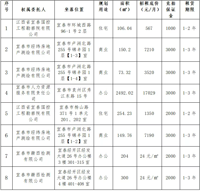 公司定于2026年1月19日下午15:30在宜春市國有資本控股有限公司會議室面向社會公開招租:2個住宅類資產(chǎn)的使用權(quán)、1個辦公類資產(chǎn)的使用權(quán)、3個店面類資產(chǎn)的使用權(quán)(資產(chǎn)可以整租也可以分租)?,F(xiàn)將有關(guān)事項公告如下: